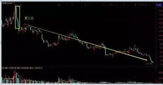这种形态由三根中阴线组成,每一根阴线的开盘价都切入上一根阴线,上下影线越短越好。这种图形如果出现在高位,表明大势可能要反转或股价要下跌,投资者应该减仓离场。