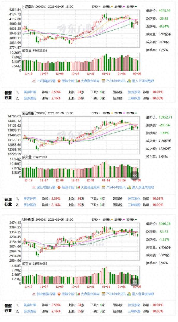 A股三大指数今日集体回调,截止收盘,沪指跌0.64%,收报4075.92点;深证成指跌1.44%,收报13952.71点;创业板指跌1.55%,收报3260.28点。