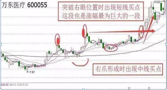 以上图汇川技术(300124)为例,5日线上穿10日线形成金叉,股价在60日均线处开始上涨,K线五连阳将股价不断推高,形成左眼,中途回档,庄家继续建仓收集筹码,触碰60日线后止跌回升。量能并未明显放大的前提下股价再次拉升到右眼位置,说明主力控盘程度高。右爪悬空说明后市走势强势,果不其然最终走出良好的上升形态。