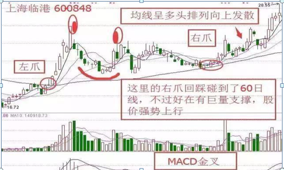 以上海临港(600848)为例,其实从形态上来说,右眼位置有点变形,但是还是能看出“金蛤蟆”形态。同样的,在60日附近该股股价开始启动,形成蛤蟆左爪,几根放量阳线到达一个小高峰,形成蛤蟆左眼。中途回踩至60日线止跌,后再次小放量上攻,形成蛤蟆右眼。此后量能一直维持缩小,当K线再次回踩60日线时量能缩到极致。右爪形成后,MACD金叉释放看涨信号,随后一根巨量长阳打开上升通道,均线呈多头排列向上发散,股价不断攀升。