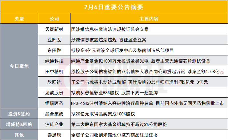 【天晟新材:因涉嫌信息披露违法违规被证监会立案】天晟新材(300169.SZ)公告称,公司于2月6日收到中国证监会立案告知书,因公司涉嫌信息披露违法违规,中国证监会决定对公司立案。本次立案可能涉及2023年度关联交易未披露事项。目前公司生产经营正常,立案调查事项不会对公司正常生产经营活动产生重大影响。公司将积极配合调查,严格履行信息披露义务。