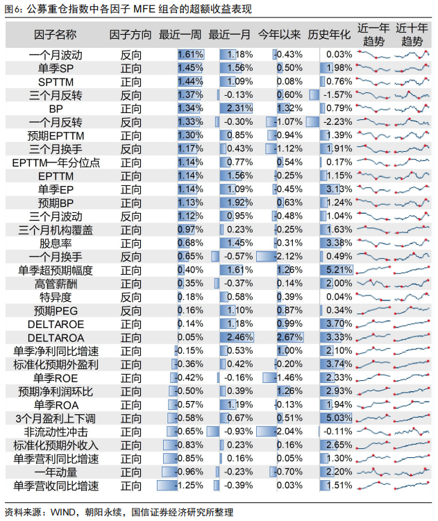 我们以公募重仓指数为样本空间,对常见选股因子构造其相对于公募重仓指数的MFE组合并跟踪其表现,近期表现如下图。