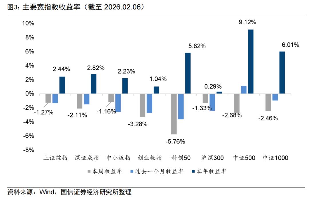 上周A股市场主要宽基指数全线下跌,中小板指、上证综指、沪深300指数收益靠前,收益分别为-1.16%、-1.27%、-1.33%,科创50、创业板指、中证500指数收益靠后,收益分别为-5.76%、-3.28%、-2.68%。