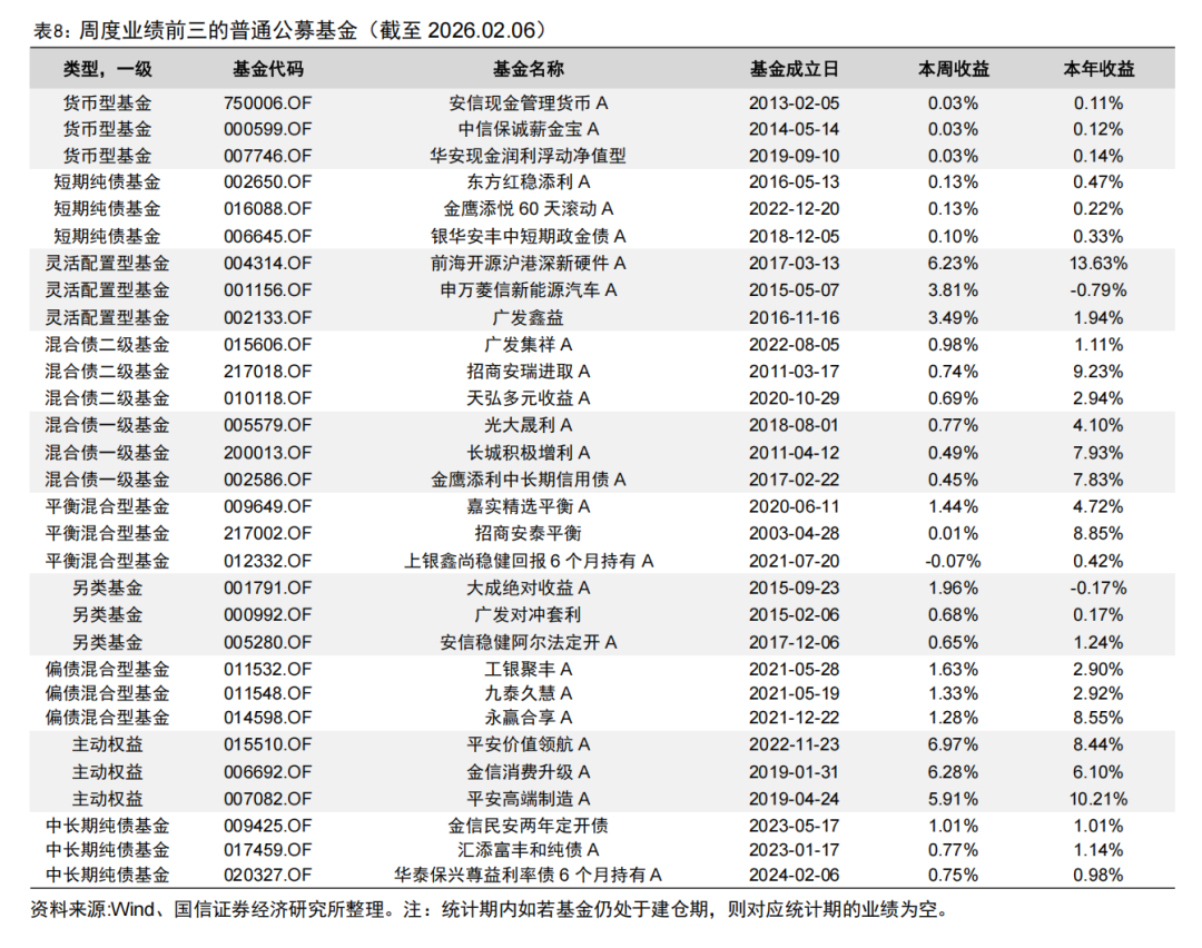 上周主动权益、灵活配置型、平衡混合型基金收益分别为-2.00%、-1.34%、-1.63%。今年以来另类基金业绩表现最优,中位数收益为6.96%,主动权益型、灵活配置型和平衡混合型基金的中位数收益分别为4.12%、3.49%、3.68%。