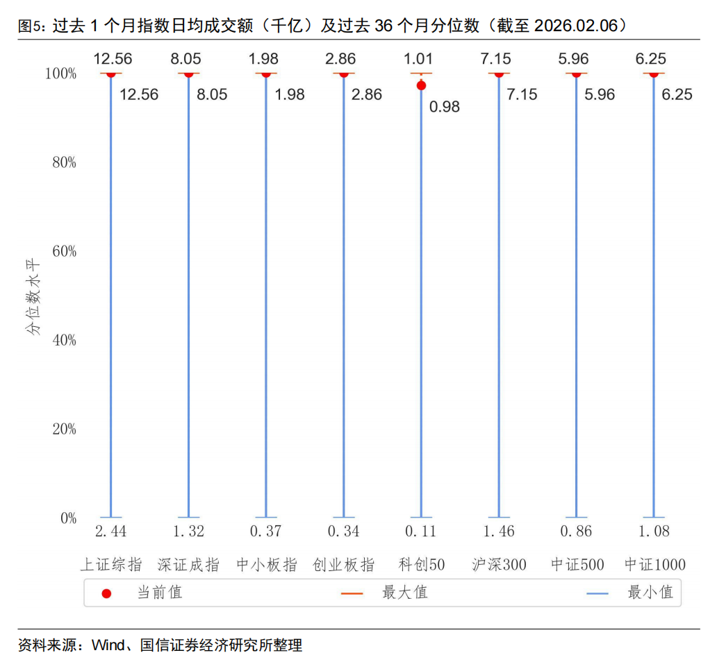 按月度来看,过去一个月主要宽基指数的日均成交额均有所下降,主要宽基指数均位于过去36个月95%-100%的历史分位水平。