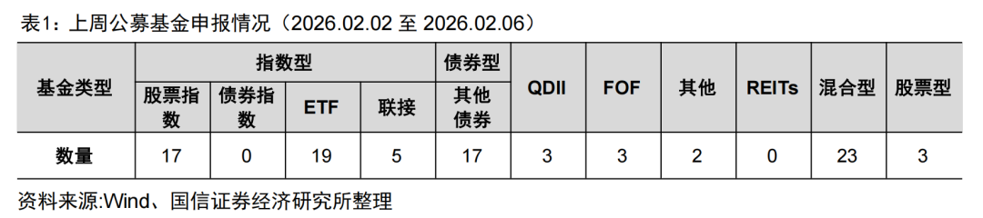 上周共上报92只基金,较上上周申报数量有所增加。申报的产品包括3只FOF、3只QDII,17只ETF,恒生A股电网设备ETF、国证石油天然气ETF等。