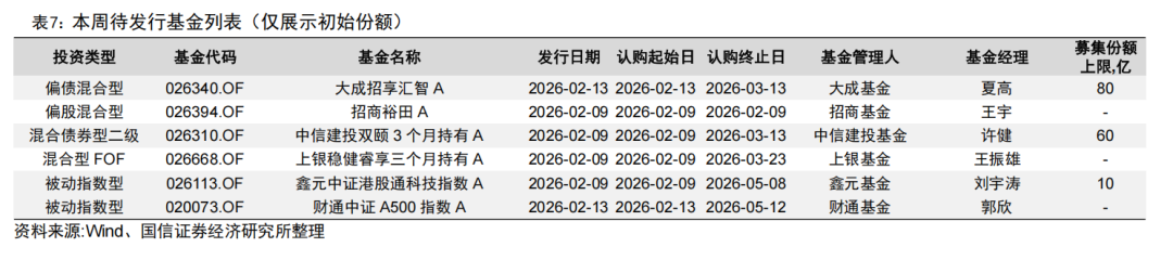 本周将有6只基金进入发行阶段,其中被动指数型(2只)、偏债混合型(1只)、偏股混合型(1只)。