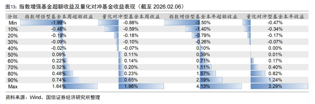 上周指数增强基金超额收益中位数为0.09%,量化对冲型基金收益中位数为0.11%。今年以来,指数增强基金超额中位数为0.39%,量化对冲型基金收益中位数为0.01%。