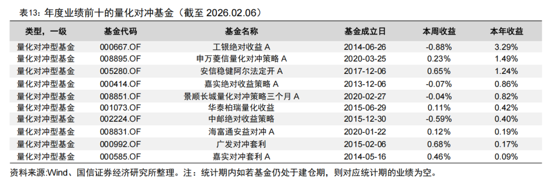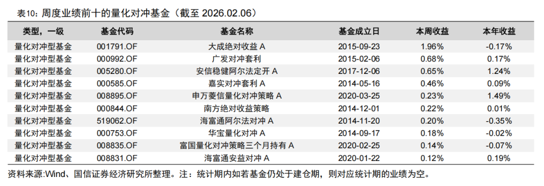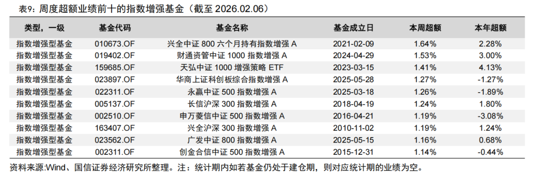 统计指数增强基金相对基准的超额收益和量化对冲型基金的收益情况,新成立基金在6个月建仓期满之后才参与统计。上周指数增强基金超额收益中位数为0.09%,量化对冲型基金收益中位数为0.11%。今年以来,指数增强基金超额中位数为0.39%,量化对冲型基金收益中位数为0.01%。