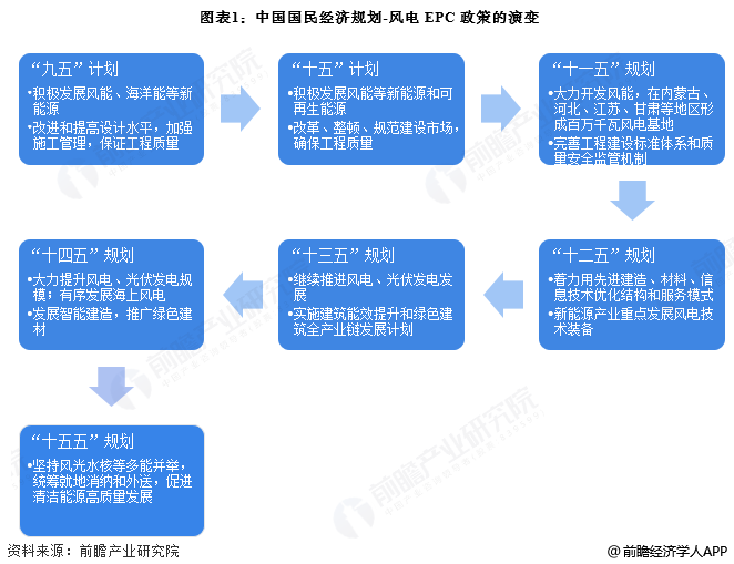 EPC总承包管理模式后,能够充分发挥出项目工程技术能力、企业融资能力以及项目管理能力,能够实现风电项目的设计环节、采购环节以及施工环节的深度交叉。根据我国国民经济“九五”计划至“十二五”规划,国家对风电EPC行业的支持政策经历了从“发展风能及改进和提高建筑设计水平”到“完善工程建设标准体系和质量安全监管机制”的变化。“十三五”规划中,我国提出“继续推进风电、光伏发电发展”以及“实施建筑能效提升和绿色建筑全产业链发展计划”,“十四五”规划中明确“发展智能建造”的重要任务。“十五五”规划提到要坚持发展风力发电,促进清洁能源高质量发展。