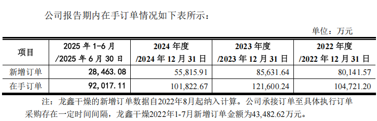 在基本面已显疲态之际,龙鑫智能却计划募资4.58亿元用于扩产。然而,其订单储备正加速下滑:2023年末在手订单为12.16亿元,到2024年末已减至10.18亿元;2025年上半年新增订单仅2.85亿元,在手订单9.20亿元。