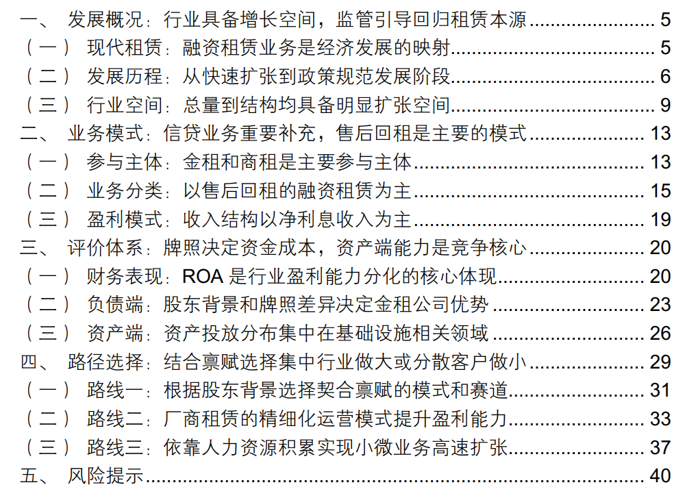 l 租赁行业错位竞争特征明显,结合禀赋选择集中行业做大或分散客户做小是竞争方向选择的普适性规律。股东背景是决定不同租赁公司禀赋进而影响经营策略的核心因素。根据股东背景,可以将租赁行业进一步细分为银行系/产业系/平台系/三方系。股东实力对应融资能力、资产优势等区别将传导至经营策略选择,可以将租赁公司的经营策略大致分为三条路径。1)具有强大股东背景的公司根据母公司禀赋选择经营方向。包括负债端成本相对较低的大型银行系金租公司、凭借母公司资产端产业/地域优势深入细分赛道经营的产业系和平台系公司。中小银行系金租公司和第三方租赁公司负债端成本相对较高,但市场化程度高,共同点在于以完善的服务体系和专业化程度吸引小微客户,实现和大型租赁公司的错位竞争。具体路径又可分为两类:2)差异化业务模式和完善服务体系提升盈利能力。主要案例为江苏金租,通过厂商租赁模式实现业务在不同细分行业的批量化复制,包括科技、风控在内的完善服务体系提升服务效率同时加强厂商粘性。3)依靠密集的人力资源累积实现业务扩张。主要案例为仲利国际、永赢金租,通过细化的区域布局和标准化作业流程,提升经营管理效率、压缩业务成本。
