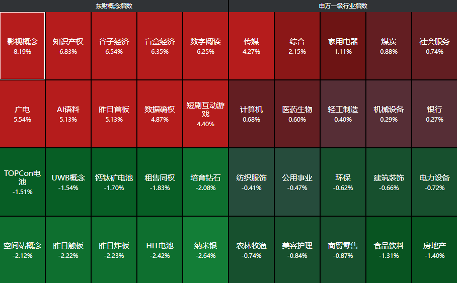 分行业来看,传媒、综合、家用电器、煤炭、社会服务等行业领涨,房地产、食品饮料、商贸零售、美容护理等行业领跌。