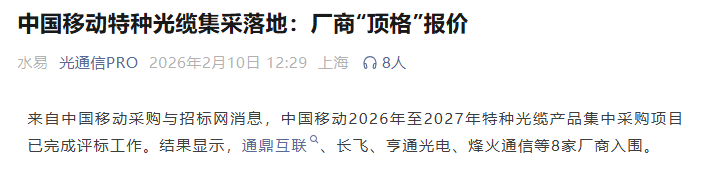 据报道,中国移动2026年至2027年特种光缆产品集中采购项目已完成评标工作。结果显示,通鼎互联、长飞、亨通光电、烽火通信等8家厂商入围。项目设置最高投标限价,最高投标限价为不含税总价25124.71万元人民币。从中标候选人的报价来看,除了第1名通鼎互联外,其他7家厂商均按照最高限价进行投标。近期由于光纤持续涨价,厂商更有底气顶格报价。