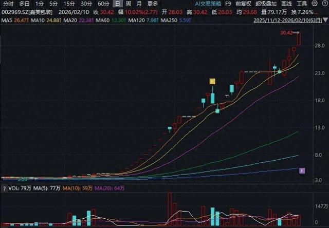 2月10日,嘉美包装(002969)再度涨停。自2025年12月17日以来,公司股价涨幅已高达567.11%,最新报收30.42元/股,市值334亿元。