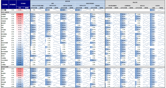 ► 基本面弱,交易也弱:暂时回避。基本面和资金交易层面均缺乏吸引力,说明既没有明确的盈利改善或估值安全边际,交易结构也不够健康,处于流动性不足或过热阶段,如部分资本品、汽车及零部件、电商、家庭用品等,这些板块短期缺乏催化,处于被动等待基本面拐点的阶段。