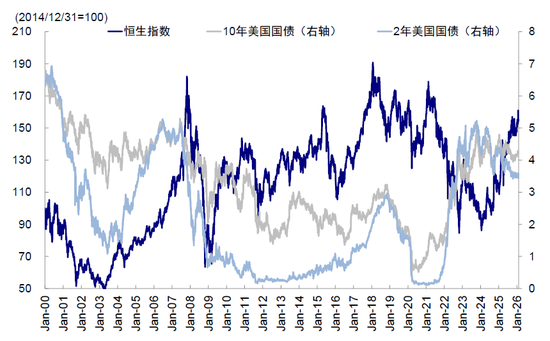 ► 市场担忧流动性收紧:特朗普提名“相对鹰派”且支持缩表的沃什为新任美联储主席,投资者担忧全球流动性趋紧。这一预期直接冲击了对流动性高度敏感的各类资产,恒生科技、纳斯达克和比特币等同步疲软印证了这一影响。沃什支持降息,但其支持缩表的姿态使得降息沿着利率曲线往长端传导的效果被部分抵消,曲线或因此变陡。不论是基于历史经验还是逻辑分析,美债长端利率对港股的边际影响均更为显著:美债10s2s期限利差与恒指走势整体负相关,且盈利兑现靠后、对长期贴现率敏感的新经济板块在港股占比较大。