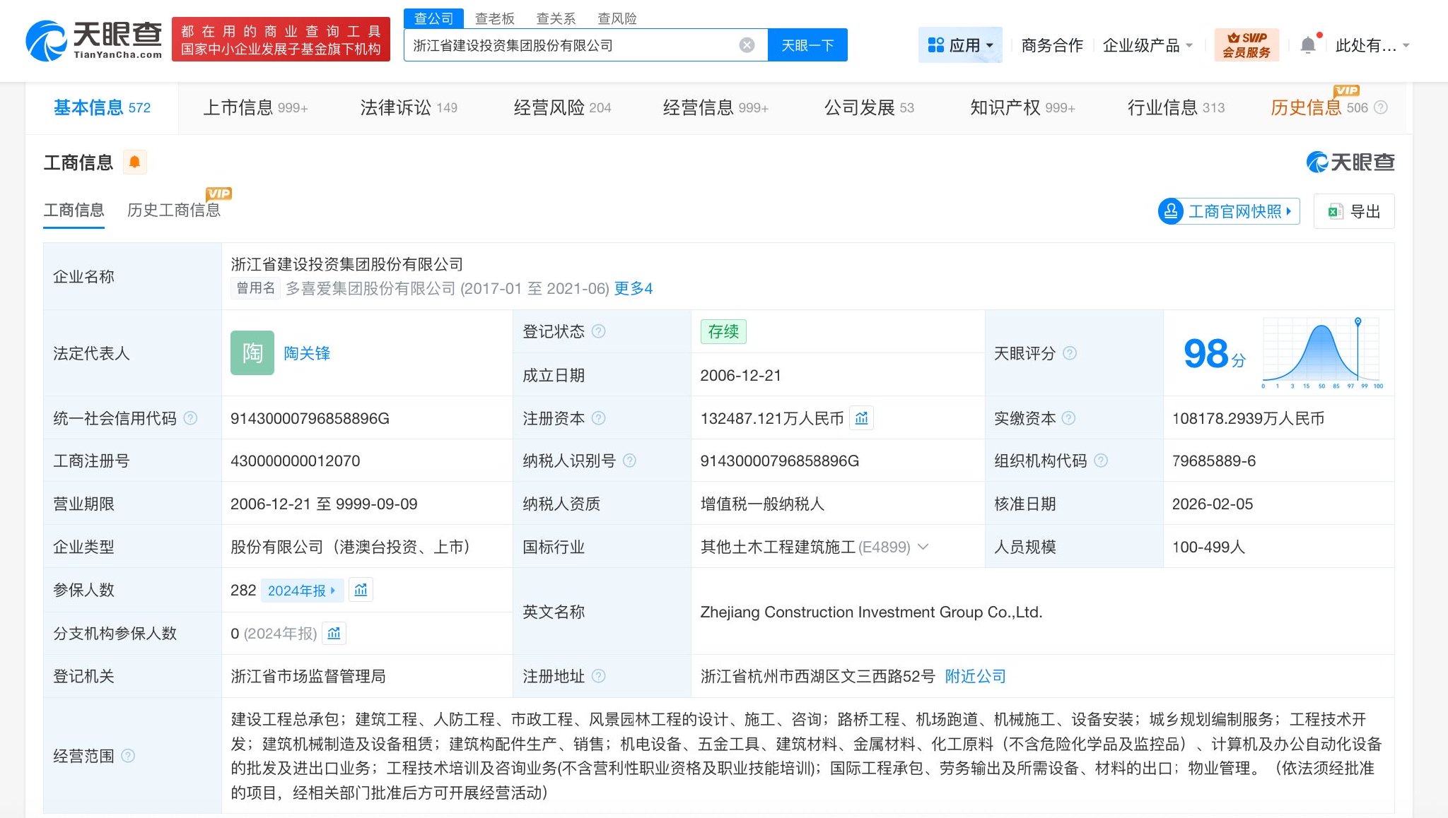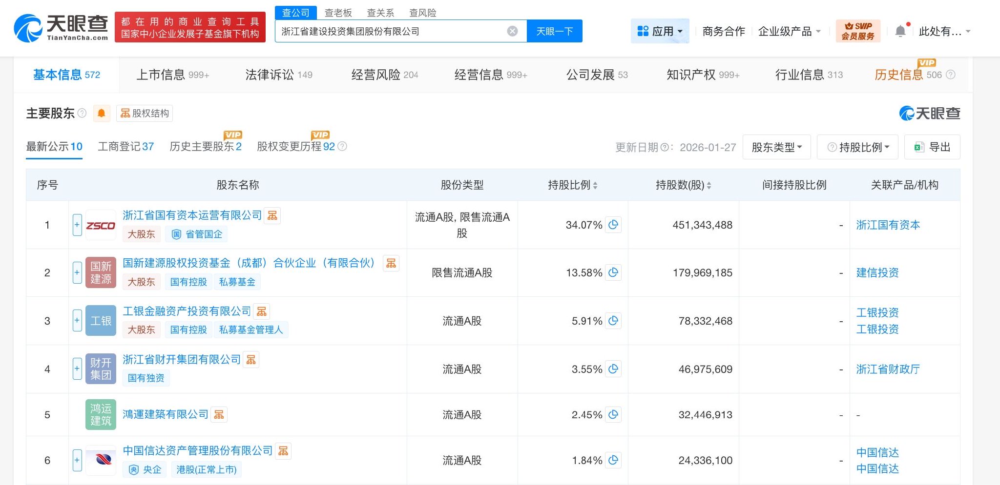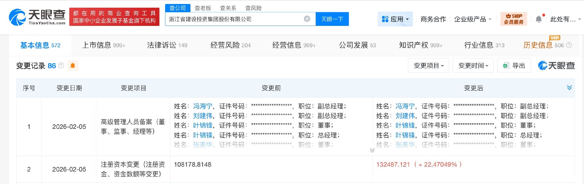 每经AI快讯,天眼查App显示,近日,浙江建投(002761)发生工商变更,注册资本由约10.8亿人民币增至约13.2亿元人民币,增幅约22%。浙江省建设投资集团股份有限公司成立于2006年12月,法定代表人为陶关锋,经营范围含建设工程总承包,城乡规划编制服务,工程技术开发,建筑机械制造及设备租赁,建筑构配件生产、销售,工程技术培训及咨询业务等。股东信息显示,该公司由浙江省国有资本运营有限公司、国新建源股权投资基金(成都)合伙企业(有限合伙)、工银金融资产投资有限公司等共同持股。