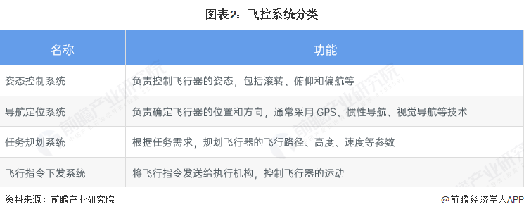 根据陈金良、高文明、史继刚等人编写的《无人机飞行管理》,无人机系统主要包括六大系统,分别为无人飞行器分系统、任务设备分系统、测控与信息传输分系统、指挥控制分系统、发射与回收分系统、保障与维修分系统。其中,飞控系统是无人机最重要的系统之一。