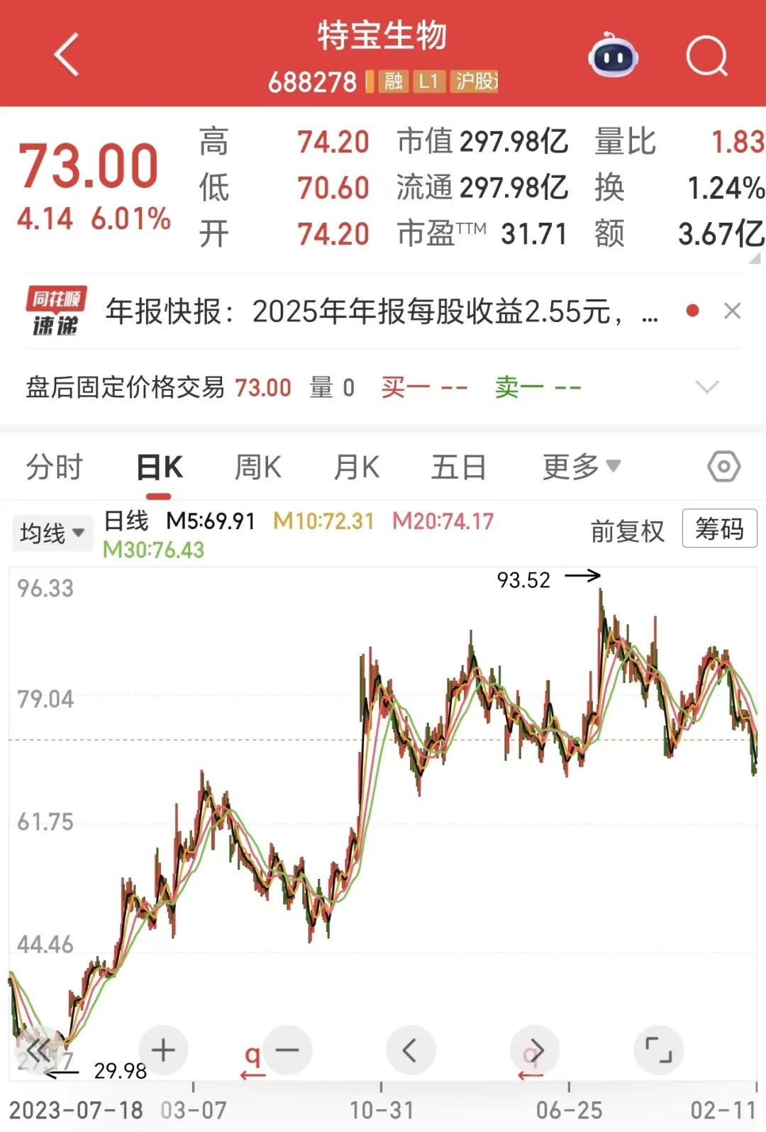 健业家首发|2月10日,厦门特宝生物工程股份有限公司(证券代码:688278,证券简称:特宝生物)发布2025年度业绩快报公告,全年业绩稳步增长。或受业绩影响,2月11日,公司股价高开高走,收涨6.01%,市值297.98亿元。