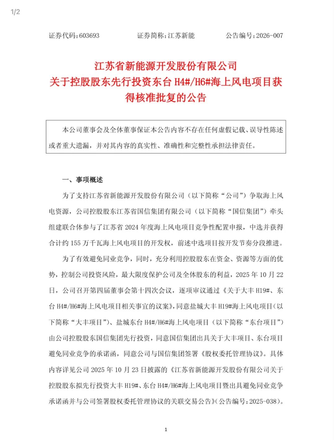 「风电之音」获悉,2月14日,江苏新能发布关于关于控股股东先行投资东台 H4#/H6#海上风电项目获得核准批复的公告。