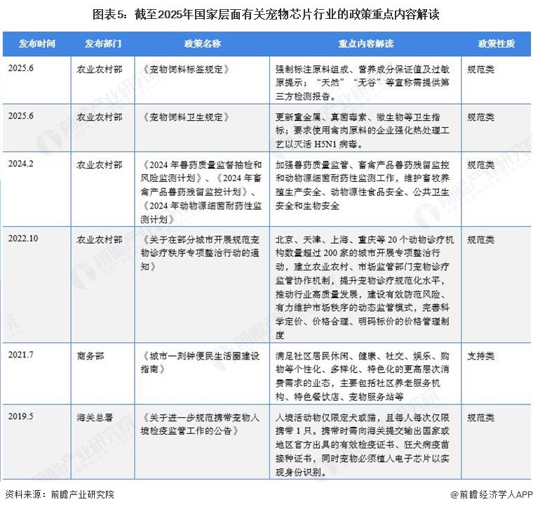 目前,我国暂未出台直接关联宠物芯片行业的国家级政策。宠物芯片行业归属于宠物经济行业,前瞻在本节在对宠物芯片相关政策进行梳理的同时,增加宠物经济行业相关国家政策作为补充。其中,海关总署公告2019年第5号全称为《关于进一步规范携带宠物入境检疫监管工作的公告》,于2019年5月1日起正式施行,提出携带基础限制:入境活动物仅限定犬或猫,且每人每次仅限携带1只。携带时需向海关提交输出国家或地区官方出具的有效检疫证书、狂犬病疫苗接种证书,同时宠物必须植入电子芯片以实现身份识别。截至2025年12月,我国宠物芯片行业相关政策汇总如下: