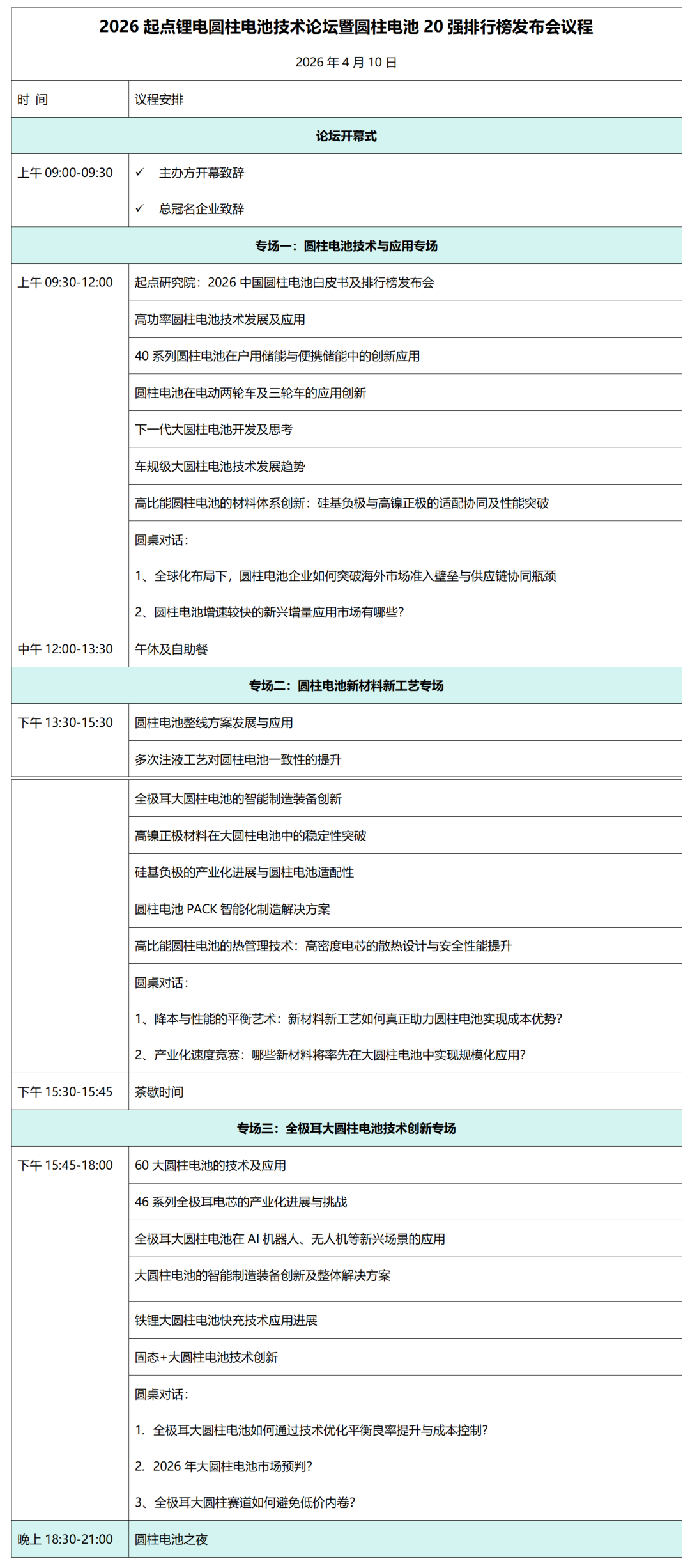 活动名称:2026(第二届)起点锂电圆柱电池技术论坛暨圆柱电池20强排行榜发布会