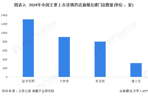 2024年,在上市连锁药店中,益丰药房新增自建门店数量超过1000家,大参林新增自建门店超过900家,老百姓和健之佳新增自建门店超过300家。