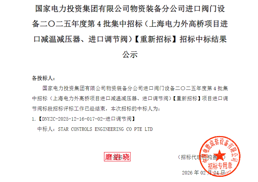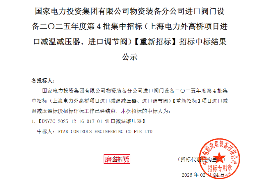 2月24日,中国电力设备信息网国家电投电子商务平台发布国家电力投资集团有限公司物资装备分公司进口阀门设备二〇二五年度第4批集中招标(上海电力外高桥项目进口减温减压器、进口调节阀)【重新招标】招标中标结果公示,详情如下: