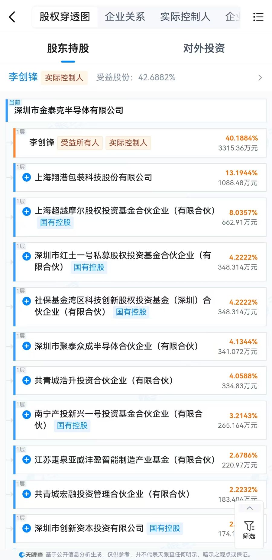 天眼查数据显示,金泰克曾获得深创投、东方汇富、亚禾资本、旭诺资产、翔港科技等诸多机构的投资。其创始人李创峰持股比例为 40.19%,第二大股东翔港科技持有其 13.19%的股份,上海超越摩尔股权投资基金合伙企业(有限合伙)持有其 8.0357%,深圳红土一号私募股权投资基金、社保基金湾区科技创新股权投资基金等分别持有其超过 4%的股份。