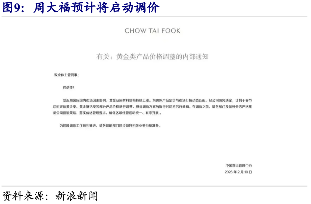 周大福等黄金珠宝品牌陆续释放提价信号,行业价格上修趋势持续强化。古法黄金阵营中,琳朝珠宝与宝兰已分别于1月底、2月初完成调价,君佩亦于2月26日预告将于3月9日调价。主流黄金珠宝品牌方面,周生生、潮宏基已分别于1月6日、1月16日对多款一口价黄金饰品进行价格上调;周大福亦计划启动调价,重点集中在一口价产品。我们认为,在高金价背景下,需求结构由婚庆向自戴悦己与审美驱动迁移,消费者对设计工艺与品牌表达的关注度提升,使定价类产品更易承接溢价并实现提价传导。同时行业竞争也将更强调产品迭代与工艺创新,具备差异化产品力的品牌有望更顺畅完成价格带上移。