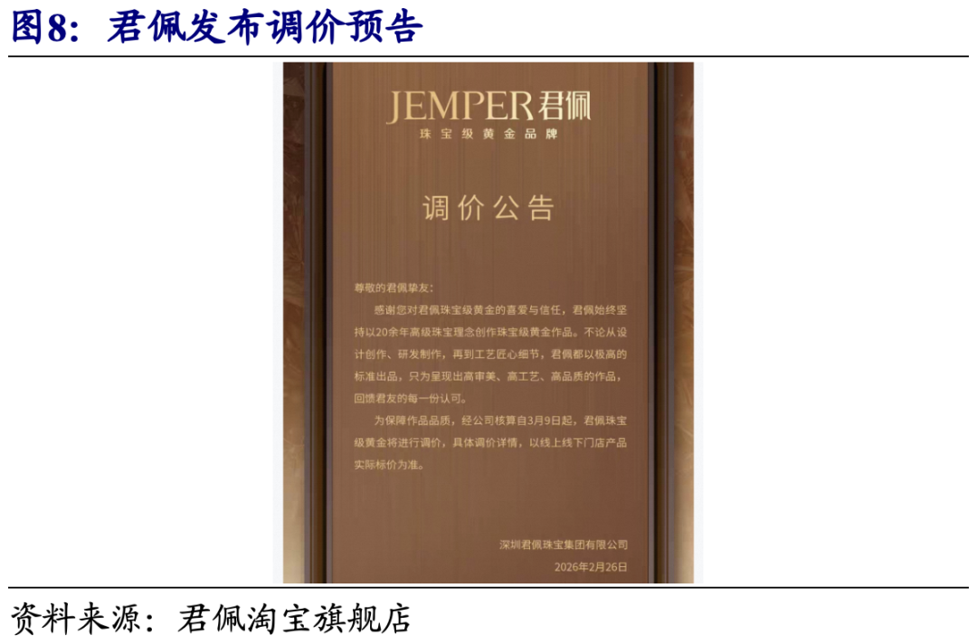 2月28日老铺黄金启动2026年首次调价,多数产品涨幅集中在20%至30%区间,对比2025年三次调价,提价幅度明显放大。调价落地前,提价预期叠加大促带动消费者购买意愿快速升温,2月26日天猫3·8焕新周品牌大促首日,老铺黄金开卖仅1秒成交额突破3亿元、全天单店成交破10亿元,同比百倍增长,消费者购买热度旺盛。我们认为,老铺调价前大促带动成交放量充分验证需求景气度并支撑短期销售额兑现,更高幅度的调价有望进一步抬升产品定价与盈利水平,对利润率形成支撑。此外,周大福等黄金珠宝品牌陆续释放提价信号,行业价格上修趋势持续强化。古法黄金琳朝珠宝与宝兰已分别于1月底、2月初完成调价,君佩亦于2月26日预告将于3月9日调价。主流黄金珠宝品牌方面,周生生、潮宏基已分别于1月6日、1月16日对多款一口价黄金饰品进行价格上调;周大福亦计划启动调价,重点集中在一口价产品。我们认为,行业需求向自戴悦己与审美驱动迁移,具备差异化产品力的品牌有望更顺畅完成价格带上移。