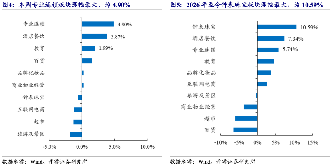 零售社服各细分板块中,专业连锁板块本周涨幅最大;2026年年初至今,钟表珠宝板块涨幅最大。在零售社服行业各主要细分板块(我们依据二级行业分类,选择较有代表性的超市、互联网电商、教育、专业连锁、百货、品牌化妆品、酒店餐饮、商业物业经营、钟表珠宝和旅游及景区10个细分板块)中,本周6个子板块上涨,其中专业连锁板块涨幅最大,周涨幅为4.90%;2026年全年来看,钟表珠宝板块年初至今累计涨幅为10.59%,在各细分板块中领跑。
