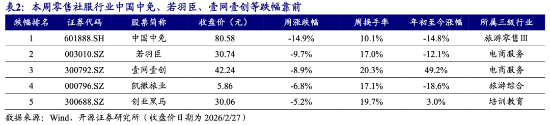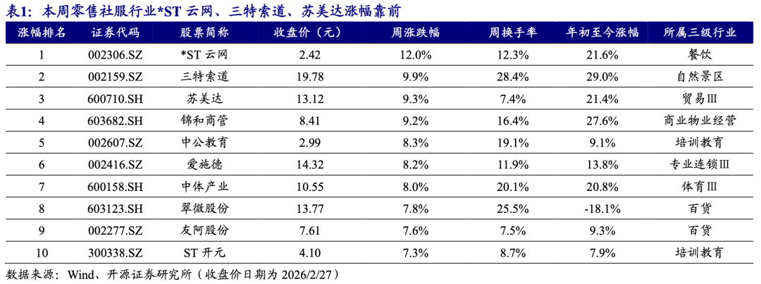 本周(数据取2月24日-2月27日,除春节假期外共4个交易日,下同),商贸零售和社会服务指数分别报收2349.12点/9368.14点,分别下跌1.64%/上涨1.68%(同期上证综指累计上涨1.98%),在31个一级行业中分别位居第30/17位。商社各细分板块中,本周专业连锁板块涨幅最大,2026年年初至今钟表珠宝板块领跑。个股方面,本周*ST云网(+12.0%)、三特索道(+9.9%)、苏美达(+9.3%)涨幅靠前。