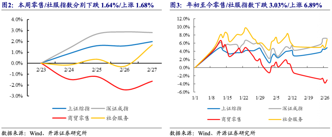 本周(数据取2月24日-2月27日,除春节假期外共4个交易日,下同)A股上涨,商贸零售和社会服务指数分别下跌1.64%/上涨1.68%。本周上证综指报收4162.88点,周累计上涨1.98%;深证成指报收14495.09点,周上涨2.80%;本周全部31个一级行业中,表现排名前三位的分别为钢铁、有色金属和基础化工。具体看,商贸零售和社会服务指数本周分别报收2349.12点/9368.14点,分别下跌1.64%/上涨1.68%,在所有一级行业中分别位列第30/17位。2026年年初至今,上证综指累计上涨4.89%,商贸零售指数累计下跌3.03%,社会服务指数累计上涨6.89%。