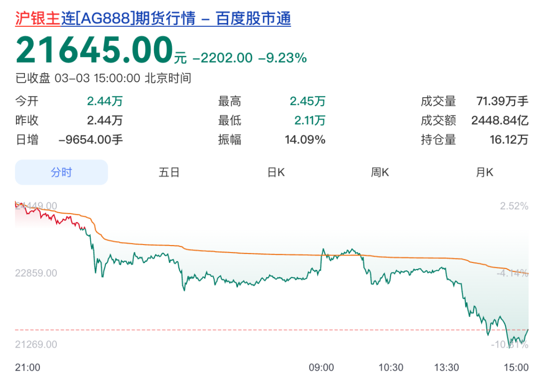 上期所沪银主力合约一度大跌超10%,截至发稿,跌9.23%,报21645元/千克。