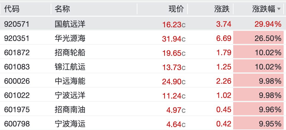 油气、航运概念延续强势,三桶油等30余股涨停。其中中国石化涨停,股价创2008年3月以来新高,中石化油服涨近18%;国航远洋30CM涨停,中远海能、招商南油、宁波海运、宁波远洋涨停,招商轮船走出8天5板,续创历史新高。港股石油股同步走强,山东墨龙大涨超48%。洲际油气6天4板,水发燃气3连板,中国石油(最新市值2.4万亿元的巨头)、中国海油、山东墨龙、准油股份、海油工程、海油发展2连板。