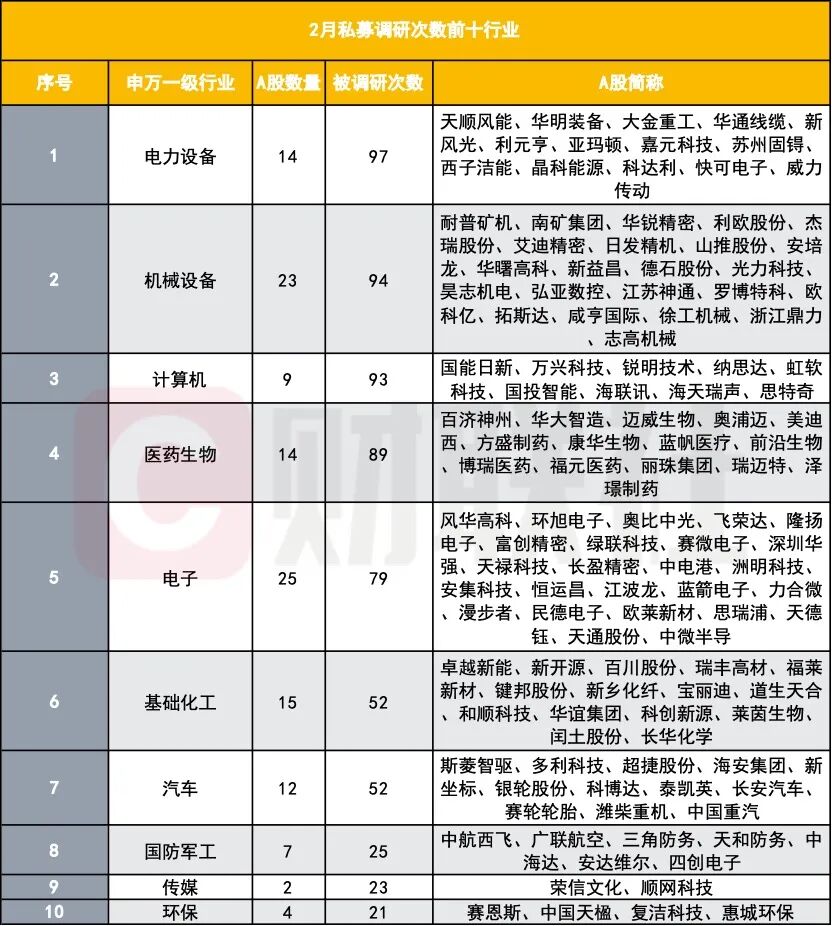 将视角进一步放大到行业层面,2月共有13个申万一级行业被私募调研次数不少于10次,其中8个行业调研次数在50次以上。电力设备行业是当月最受关注的板块之一,共有14只个股进入调研名单,合计调研次数达到97次,天顺风能、华明装备、大金重工、华通线缆等公司均被调研不少于10次。