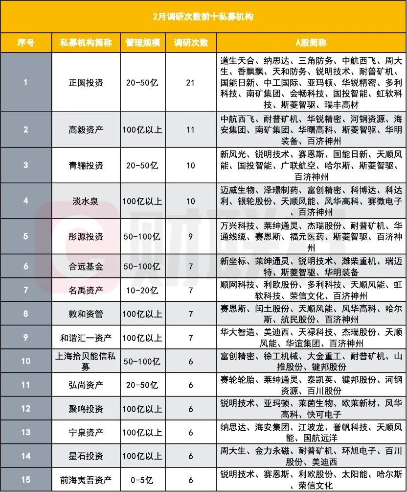 除上述提及的机构外,彤源投资、合远基金、名禹资产、上海拾贝能信私募、弘尚资产、聚鸣投资、宁泉资产、星石投资、前海夷吾资产等也在2月保持了较高的调研频率。