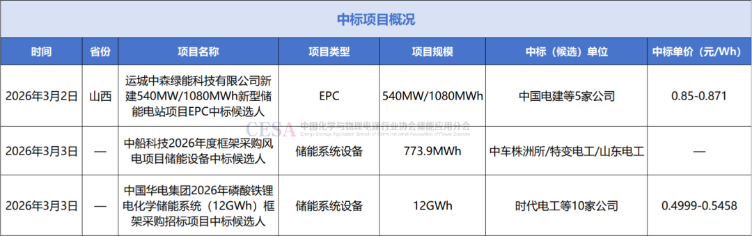中标方面,3月3日,中国华电2026年12GWh储能系统框采中标候选人公示,时代电工/中车株洲所/特变电工等7家入围第一中标候选人,折合单价区间约为0.4999-0.5458元/Wh。