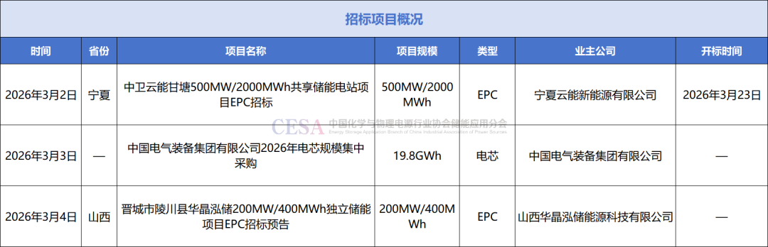 招标方面,3月3日,中国电气装备发布2026年电芯规模集中采购公告,预计采购金额约69亿元,采购范围为磷酸铁锂电芯314Ah,总容量约19.8GWh。