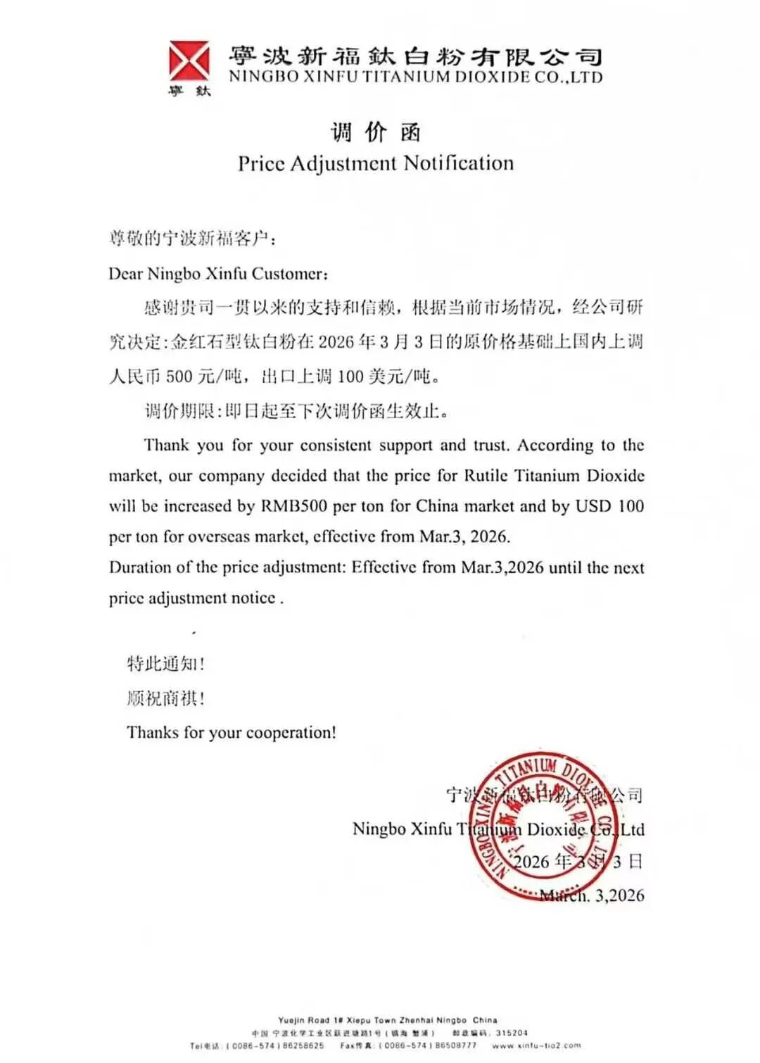 自 2026年3月初起,宁波新福钛白粉、广西金茂钛业、安徽安纳达钛业、昆明东昊科技等多家钛白粉企业集中发布调价函,自3月3日起对金红石型钛白粉价格进行统一上调:
