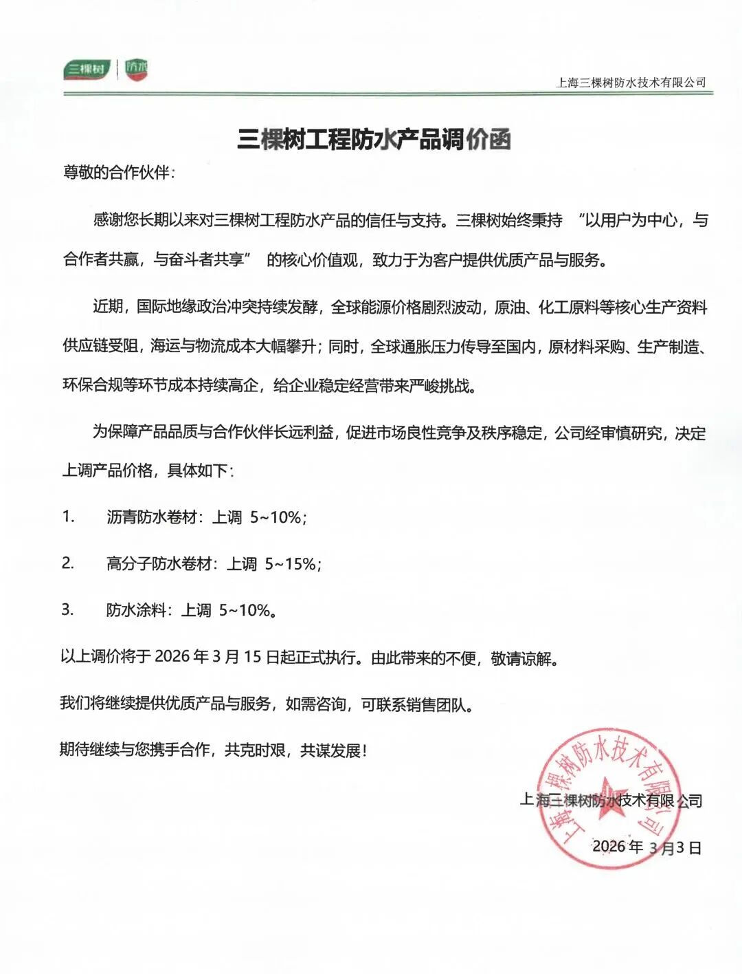 三棵树防水自3月15日起上调工程防水产品价格,其中沥青防水卷材上调5-10%,高分子防水卷材上调5-15%,防水涂料上调5-10%。
