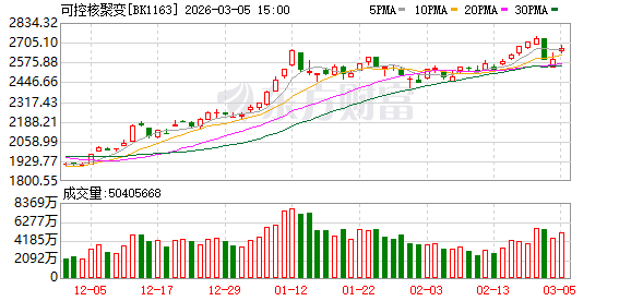 核聚变指数大幅上涨4.24%,位于万得热门指数涨幅榜前列。成份股中,百利电气、东方电气、上海电气等多股涨停;常辅股份、锡装股份、海鸥股份、中国核建等股跟涨,幅度均在7%以上。
