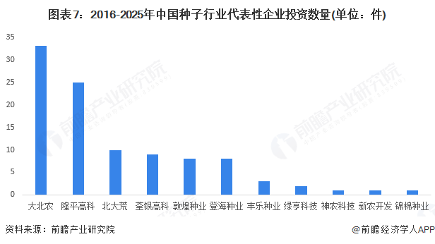 2016-2025年之间,代表性企业投资事件超过100件,其中大北农、隆平高科、北大荒三家企业投资事件数量最多,大北农、隆平高科投资时间数量超过20件,北大荒投资事件数量达到10件。