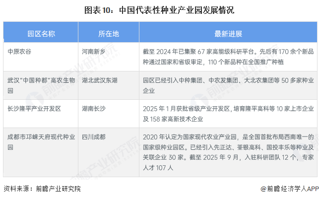 中国已经建设了一批种业相关产业园,代表性园区包括中原农谷、武汉“中国种都”高农生物园、长沙隆平产业开发区、成都市邛崃天府现代种业园等,主要产业园发展情况汇总如下: