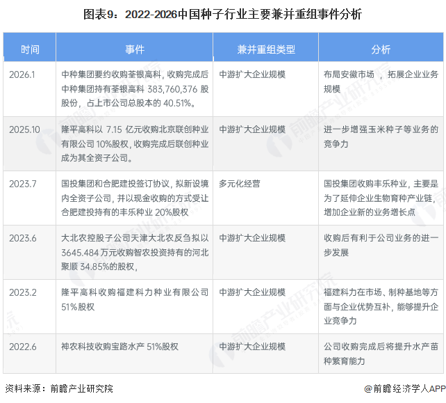 近年来,我国种子行业发生的兼并重组事件较多,主要事件为收购其他种业公司,主要目的为中游企业扩大规模。2022-2026中国种子行业主要并购事件汇总如下: