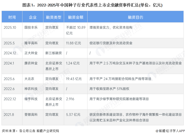 根据代表性上市企业融资公告,种子行业的上市公司融资手段主要有定向增发、新三板/北交所上市。整体来看,中国种子行业上市企业的融资主要用于建设新项目、补充流动资金。2022-2025年种子行业代表性企业主要的融资事件如下:
