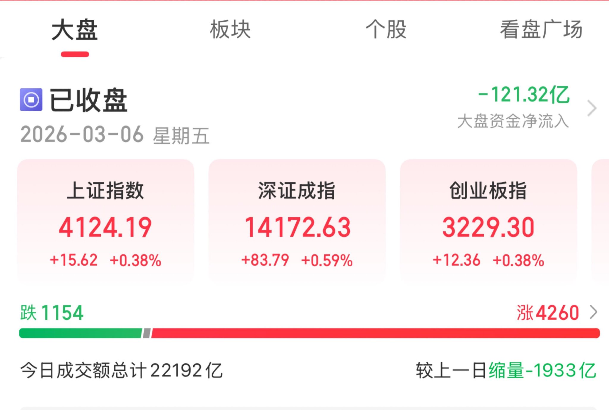 A股三大指数今日集体上涨,截至收盘,上证指数涨0.38%,深成指涨0.59%,创业板指涨0.38%,北证50指数涨0.01%,沪深京三市成交额22192亿元,较上日缩量1933亿元,三市超4200只个股上涨。