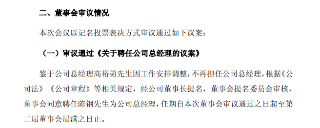 3月2日,公司召开第二届董事会第二十四次会议,审议通过了《关于聘任公司总经理的议案》,董事会同意聘任陈钢为公司总经理,任期自本次董事会审议通过之日起至第二届董事会届满之日止。